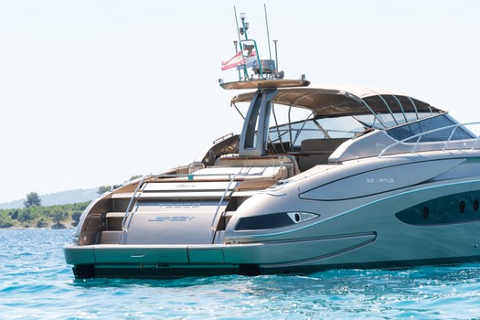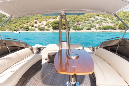 Bimini, Bow thruster, Cockpit speakers, Cockpit table, Dinghy, Electric winches, Electric windlass, Outside shower, Sprayhood, Teak deck, Barbecue, Cockpit cushions, Coolbox, Bilge pump, Swim ladder, Bathing platform, Foredeck sun cushions, Hydraulic passerelle, Air compressor, Diving mask, Electric bilge pump, Gangway, Loudspeaker (outside), Shower on deck.