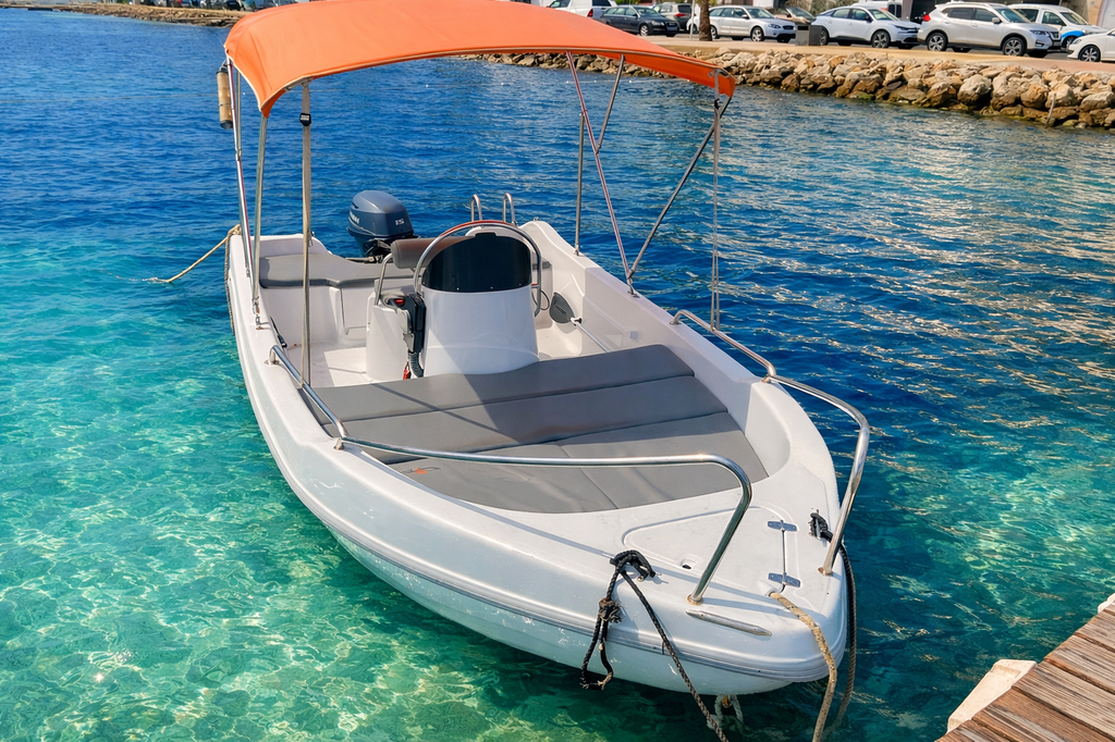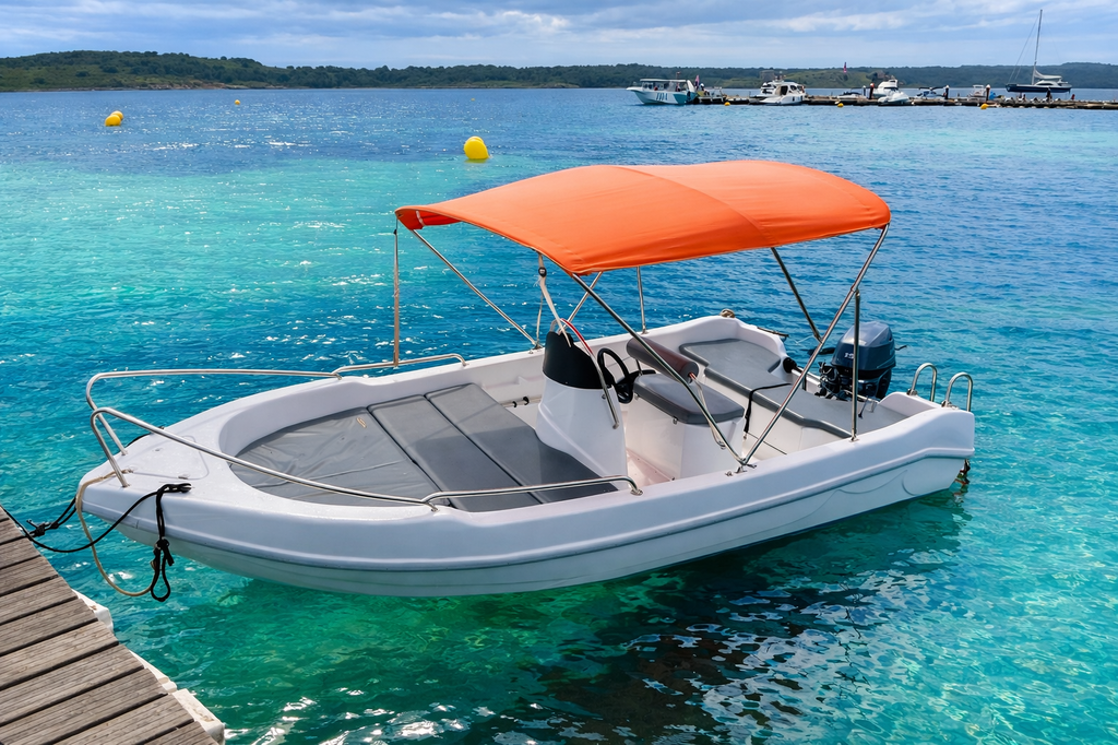 The Voraz 450 are very spacious and stable fibreglass boats, thanks to their great stability they can accommodate up to 6 passengers on board. Equipped with steering wheel, electric starter, a large bow sundeck, extra large bathing ladder, a folding awning and GARMIN nautical GPS with maps of the area with all the dangerous rocks and shallow areas, which offers peace of mind to those who want to discover a new area and guides you to the most interesting places.